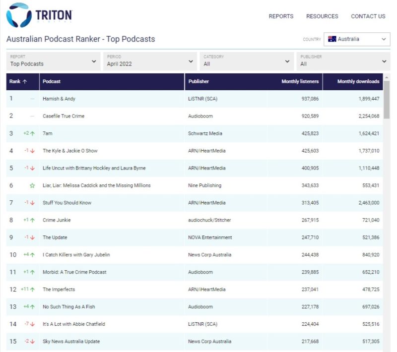 LiSTNER (SCA)的哈米什&安迪阻止Casefile真实犯罪(Audioboom),持有特里同数字的播客士兵榜首,2022年4月,一些关键的动作上个月的结果跻身前十,包括首次为骗子,骗子:梅丽莎Caddick和失踪的数百万(攻击iHeartPodcast网络澳大利亚)。