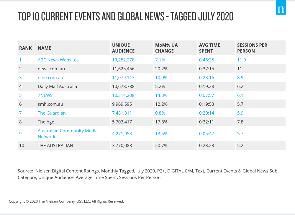 澳大利亚新闻网7月飙升了20.2%的增长,火箭回到第二尼尔森的数字内容评级(DCR),在网站5月和6月坐在第四4月份,跌至第六位。