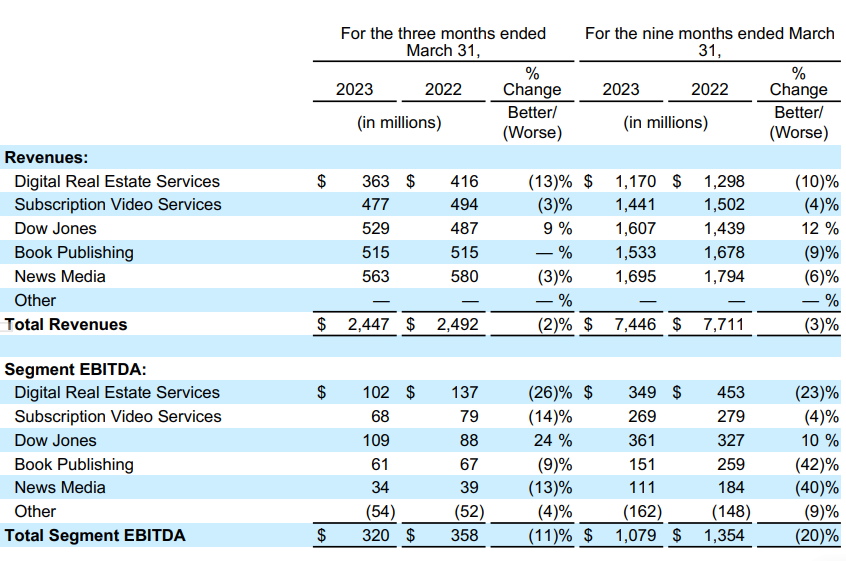 对于新闻媒体部分,总广告收入下降了1100万美元(1600万美元),同比5%,部分归因于低数字广告在新闻集团英国澳大利亚和较低的印刷广告在新。澳大利亚新闻集团(News Corp)的相关业务的总收入下降了5%。关闭数字订户澳大利亚新闻集团截至2023年3月31日104.3万消息报头(937000),比946000年(876000消息报头)。