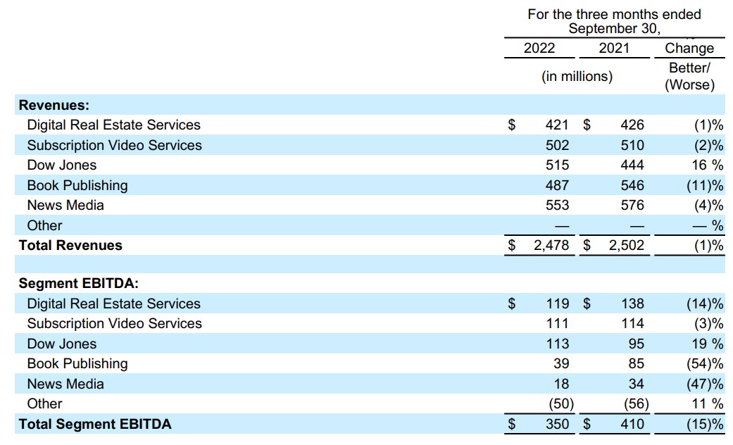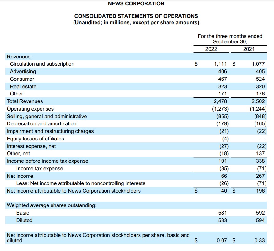 新闻集团今天公布,2023财年第一季度总营收为24.8亿美元(38.1亿澳元),下降1%而去年同期为25亿美元(38.4亿澳元).