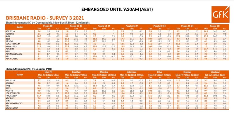 同样在早餐方面,ARN的4KQ与ABC持平,但总体而言,第二名的4KQ与第三名的4KQ只有一个百分点的差距,Triple m的4KQ在早餐时段下降了0.7个百分点,降幅最大。