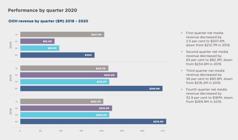 澳大利亚户外媒体行业遭受了网络媒体收入在2020年下降了39.4%,从9.355亿年的2019美元降至5.665亿美元COVID-19迫使人们呆在家里,远离中心枢纽。