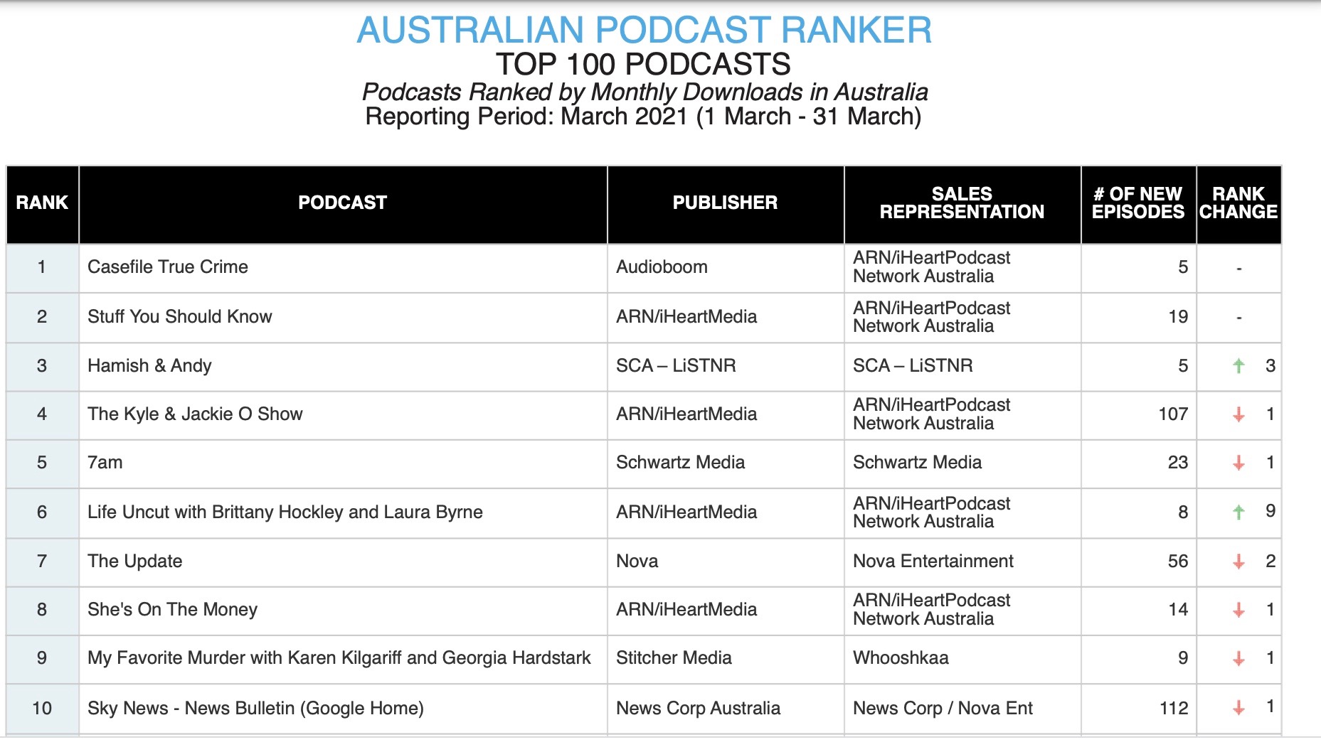 士兵提供洞察100强播客在澳大利亚以及十大出版商从3月1日到2021年3月31日,在澳大利亚以卫的播客指标测量服务。