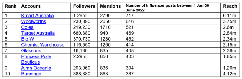 根据调查结果,零售部门和食品杂货商店前面影响力营销时,凯马特澳大利亚出来上面有2790提到700多有影响力的人,其次是沃尔沃斯2050提到616年有影响力的人。