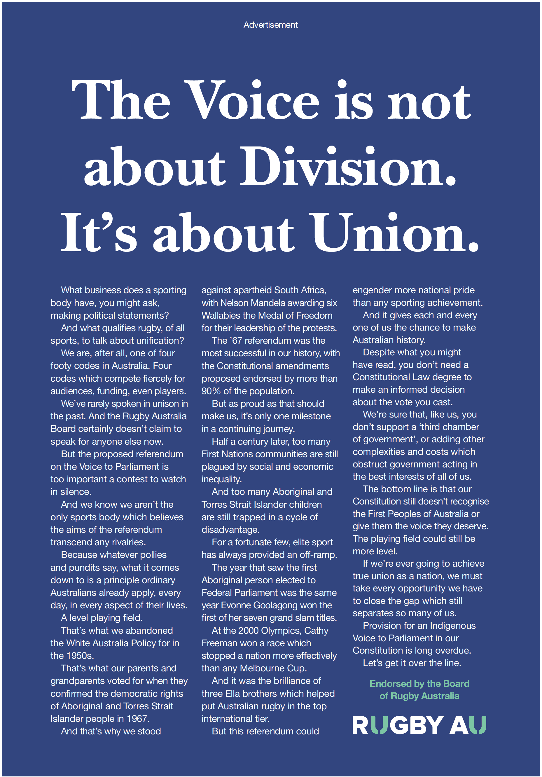 橄榄球澳大利亚议会支持本土的声音宣布通过购买整版的广告在《悉尼先驱晨报》和澳大利亚金融评论。