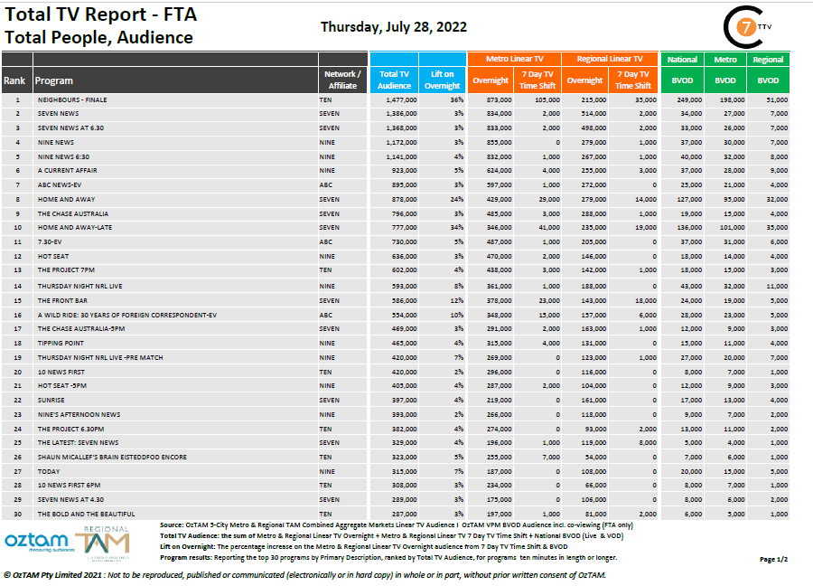 在7月28日最新的每日综合电视总报告中,《十时邻居》的最后一集是全国线性收视率最高的节目,有147.7万观众,其中BVOD有24.9万观众,上升了36%,是所有节目中升幅最大的。