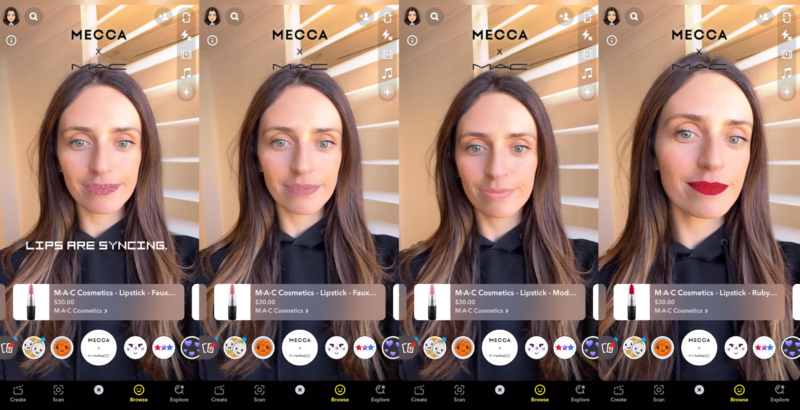 可以从今天开始,基于“增大化现实”技术的镜头提供了创Z——“Snapchat代”——一种无缝交互,试穿并点击购买MAC口红在麦加,实时信息是直接从麦加的MAC产品目录。