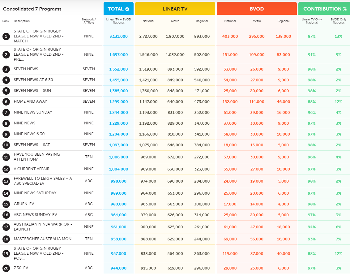 在前20名的节目中,Nine有9个节目进入前20名,其中Nine News占据4个席位,《Origin State》对第二款游戏的报道占据3个席位,《澳大利亚忍者战士》发布占据1个席位,《A Current Affair》占据1个席位。