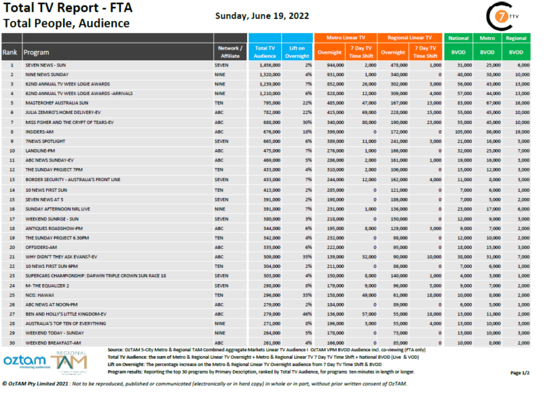 在6月19日最新的电视综合报告中,周日的《七新闻》是全国线性排名第一的节目,有145.6万观众,其中BVOD有3.1万观众,上升了2%。本周涨幅最大的是ABC电视台的儿童节目《本和霍莉的小王国》,涨幅达到46%。