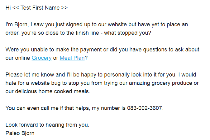你欢迎系列、赢回系列,签约但从未命令的部分应该收到高度个性化的电子邮件在纯文本介绍你的品牌,问他们为什么他们停止订购,或者问他们是否有问题检查。每个系列都应该有一个员工的名字而不是简单的你的商业名称。