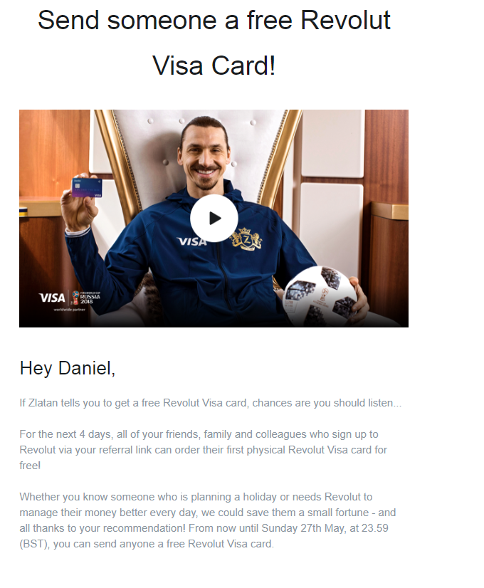 伊布是最大的体育图标现在被许多人尊敬。这封邮件是有趣的。即使你不想发送免费Revolut卡片给朋友,电子邮件将微笑在你的脸上,你更容易打开下一个他们发送电子邮件。