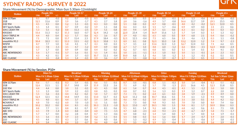 在2022年第八次也是最后一次广播收视率调查中,Nine的本·福德汉姆将KIIS1065的凯尔和杰基·奥挤下了早餐榜首,2GB也保持了悉尼第一的位置。参见上次调查在这里.