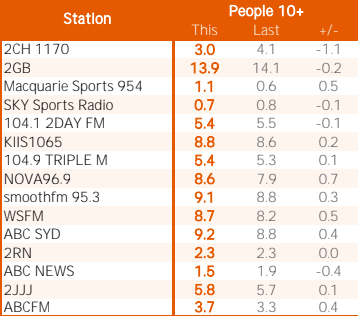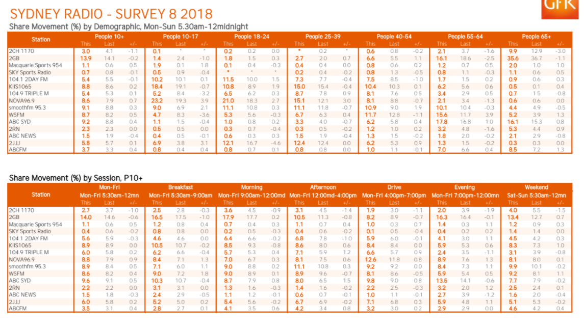 总的来说,2 gb的艾伦·琼斯在早餐时段,以16.5%的份额——下降一个点从去年的调查,而ABC悉尼麦格理体育电台发表了10.3%,早餐,马克·利维和马克·里德尔,上涨0.4点,至1.2%的份额。