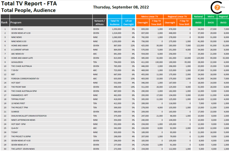 在9月8日最新的每日综合电视总报告中,《七新闻》周四的这一集在全国线性节目中排名第一,有1350万观众,其中BVOD的观众有34000人,上升了3%。10号频道的Gogglebox收视增幅最大,达32%,总观众人数达79.4万人。