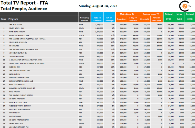 9还赢得了主要渠道份额,周日收视率最高的多渠道是7Mate,份额为4.8%。