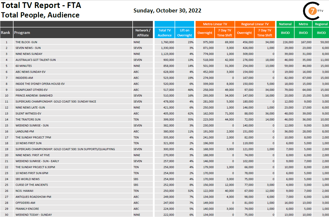 与此同时,在截至11月5日的当周,《第九频道》以31.6%的收视份额领先《第七频道》的27.7%,而ABC则以17%的收视份额紧随其后,《第十频道》以15%的收视份额紧随其后。