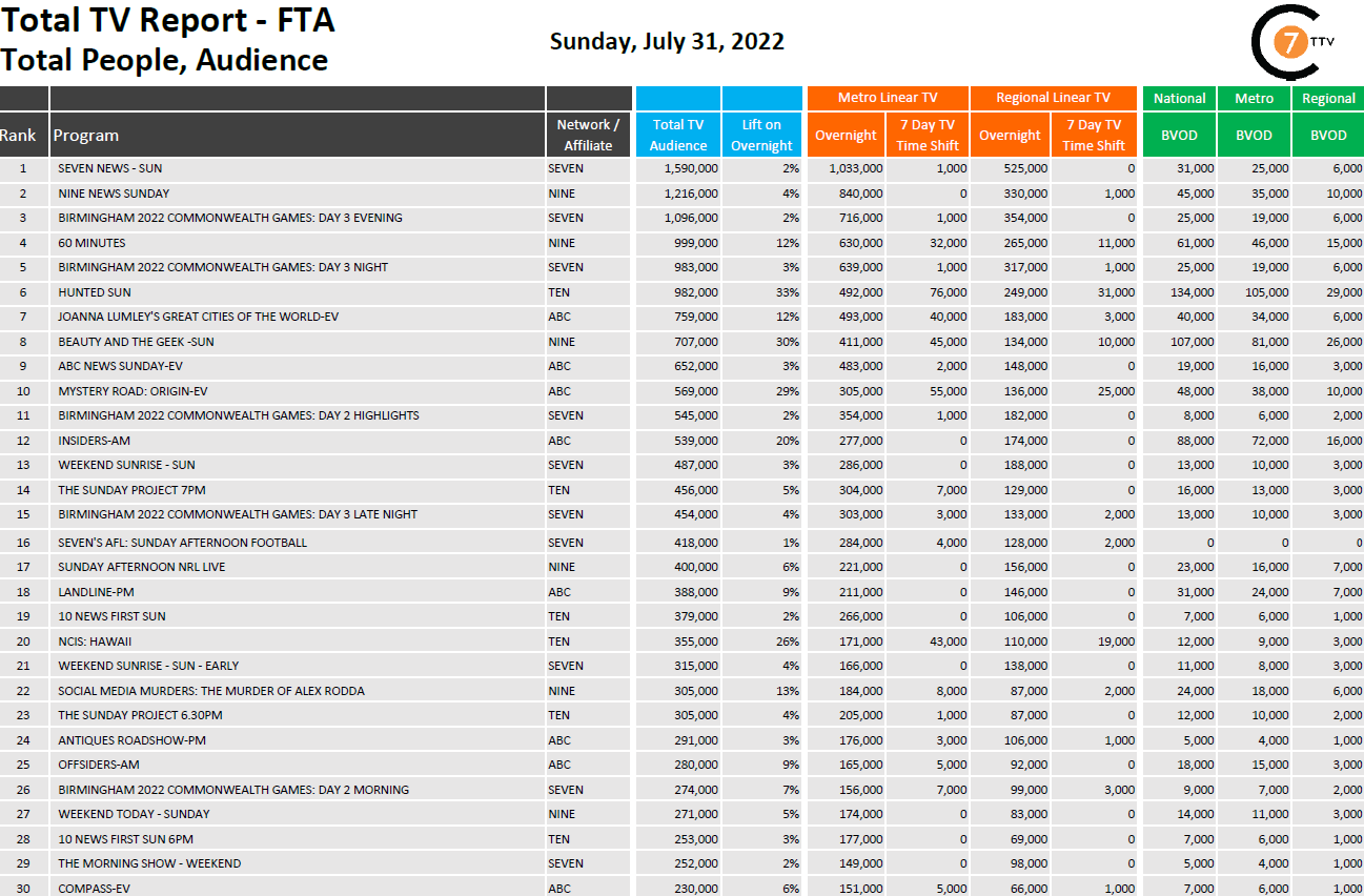 在最新的日常综合总电视报道7月31日,七消息是# 1在线性计划在全国范围内,有159万观众,包括31000 BVOD,上升了2%。本周最大的提升是一个集美丽和极客九上升30%,707000年总观众播出。