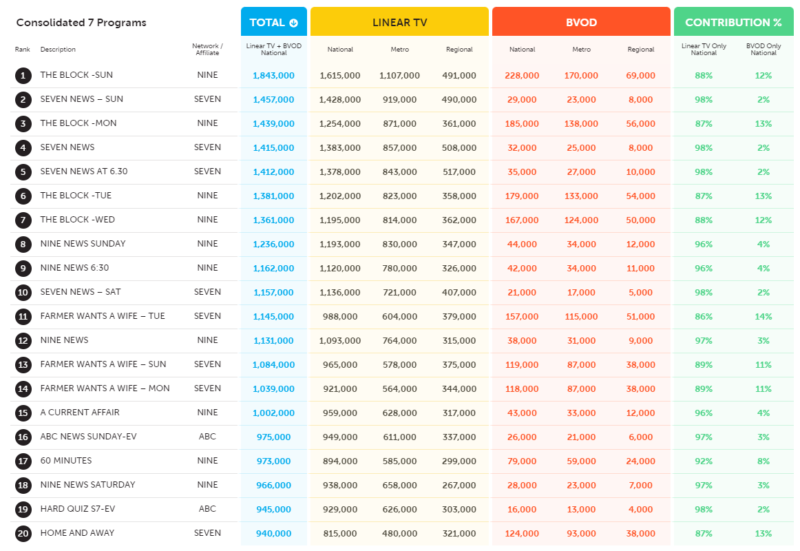 前20名中有7档节目占据8席,其中《Seven News》占据4席,《农夫要老婆》占据3席,《主客场》占据1席。