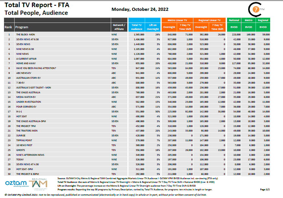 In the latest Daily Consolidated Total TV Report for Monday 24 October, The Block was the #1 program nationally across linear, with 1.565 million viewers, including 228,000 on BVOD, and an uplift of 26%. The biggest uplift of the week was Seven’s 9-1-1, which saw an uplift of 50%, for a total TV audience of 551,000.
