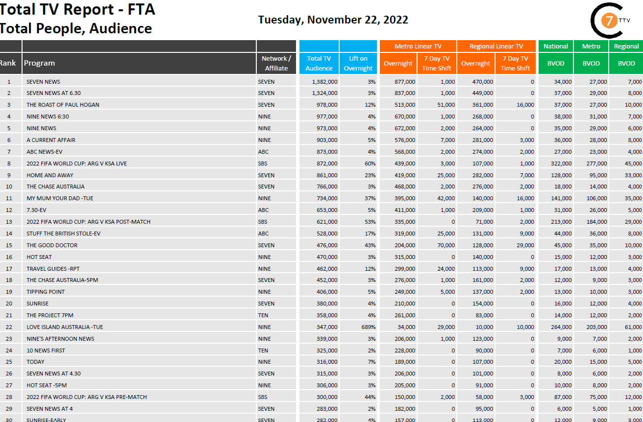 在11月22日周二最新的每日综合电视总报告中,Seven News是全国排名第一的节目,拥有138.2万观众,其中包括3.4万BVOD观众,同比增长3%。本周涨幅最大的是《九号澳大利亚爱情岛》的一集,涨幅达689%。