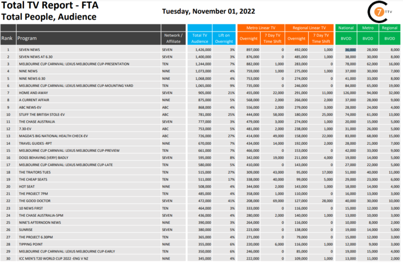 在11月1日周二最新的每日综合电视总报告中,Seven News是全国排名第一的节目,有142.6万观众,其中包括3.6万BVOD观众,上升了3%。本周涨幅最大的是七频道的《好医生》(The Good Doctor),涨幅达41%。