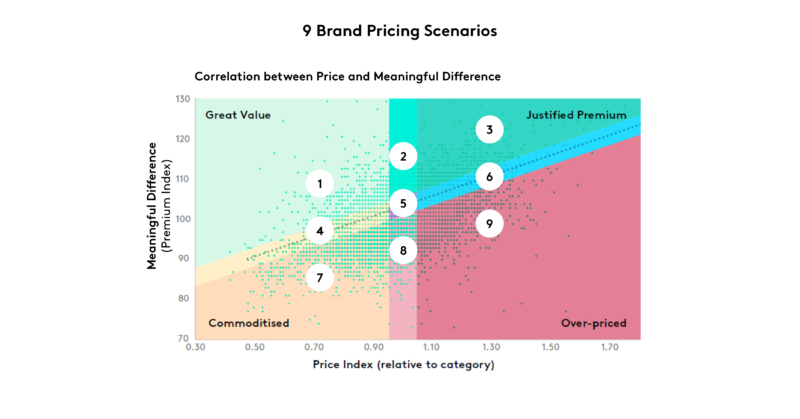 - 对于不太有意义的品牌(场景8)来说,生活更艰难,风险更大。如果你提高价格,消费者更有可能转向其他选择,尤其是如果你走在竞争对手的前面。理想情况下,任何提价都应伴随着重新投资打造品牌资产——这一前景可能不会受到金融业的过度青睐。作为营销人员,证明这是一项必要的投资,而不是一笔无谓的开支,这一点至关重要。
