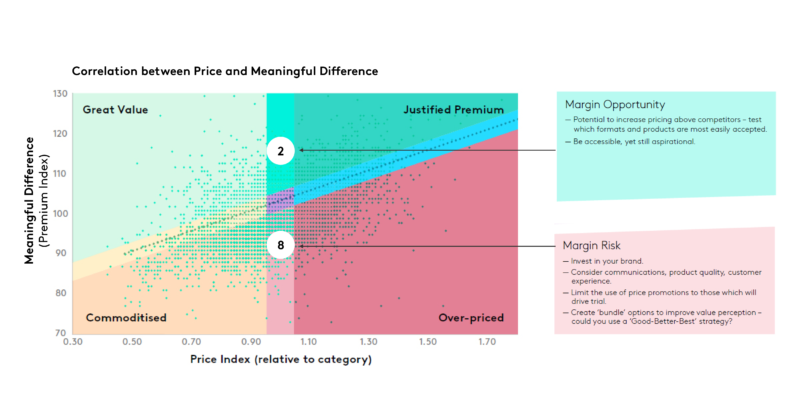 在3×3网站上,两个最大的极端是品牌将自己的目标定位于不同的价格区间——一个是价值端,另一个是高端端。但对于这两个品牌必须做出的决定来说,对品牌实力的清晰理解至关重要。例如,一个“高价值”品牌应该明白,在与零售商的谈判中,它比竞争对手处于更有利的地位。它还可以考虑将产品范围转向价格稍高的层次。然而,一个“定价过高”的品牌有不同的目标,可能需要进行一些翻新才能在通货膨胀的环境中生存下来。