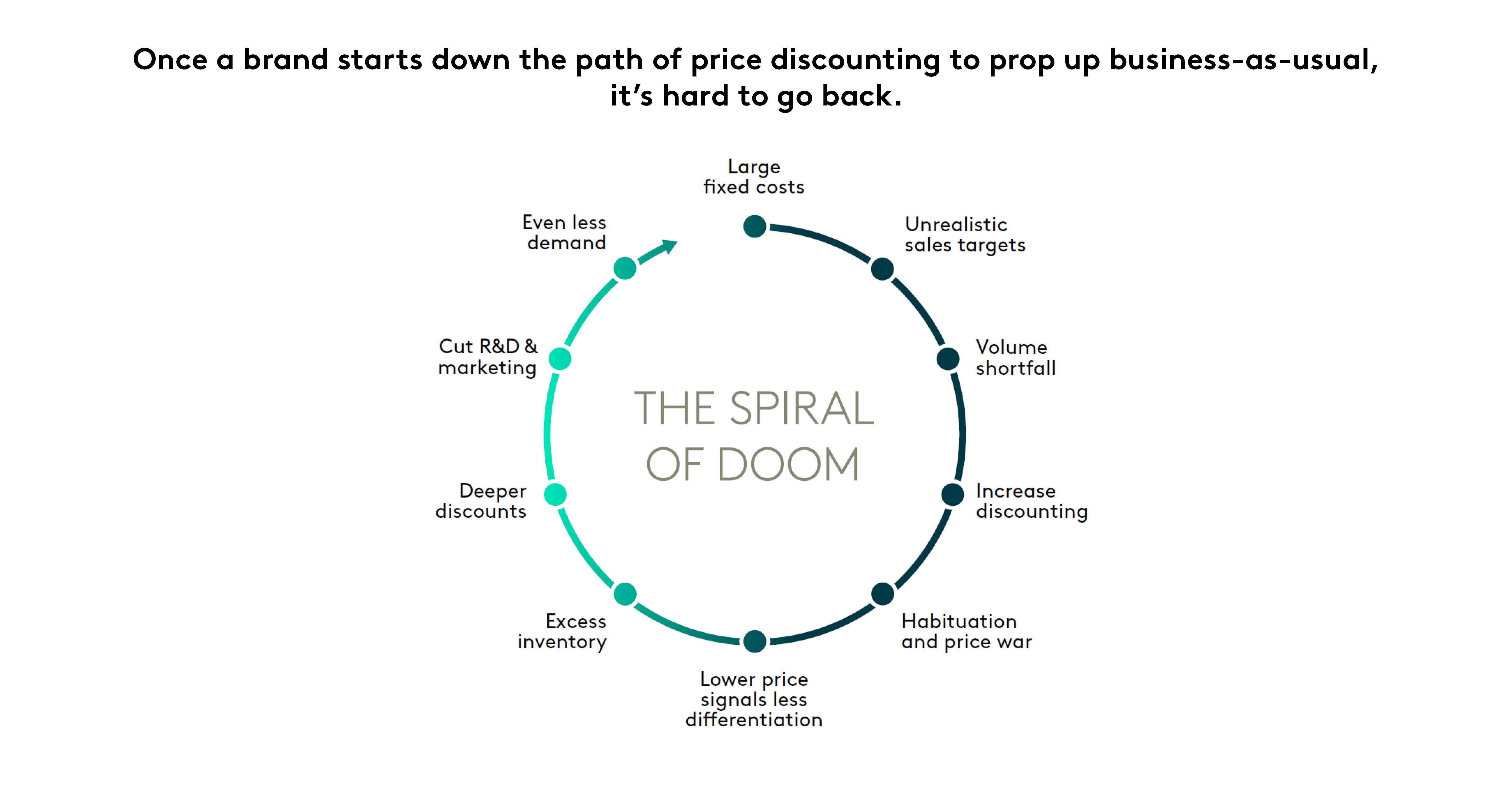 挑战在于,摆脱厄运螺旋所需的决策在短期内不会带来回报。它们是一项长期投资。而且,大多数营销人员都有理由担心,在这些投资开始产生成果时,他们会丢掉工作(在另一则关于Ritson的广告中,他对“两种主义”(Bothism)的看法可以帮助他摆脱这一陷阱)。