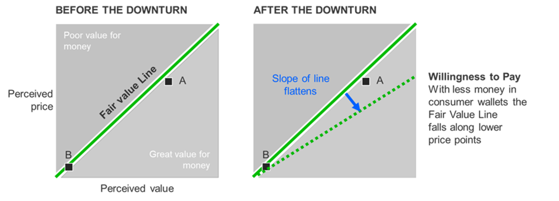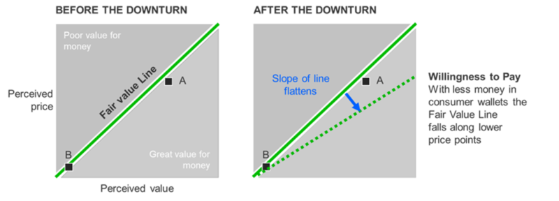 一个学习的好地方是收紧钱包的GFC。在2009年,麦肯锡观察到,随着消费者支付意愿的下降(出于必要),品牌无意中发现自己处于新的情况。品牌B发现,人们开始按他们的报价进行交易(通常情况下,人们会发现它的表现还不错),而品牌A则被困在公允价值线的错误一侧,处于股价下跌的位置。品牌A的选择变成了降低价格(迁往南方)或提高价值感知(迁往东方)。了解你的品牌有多么有意义的不同(它的无形价值),以及是什么推动着你驾驭这些场景。
