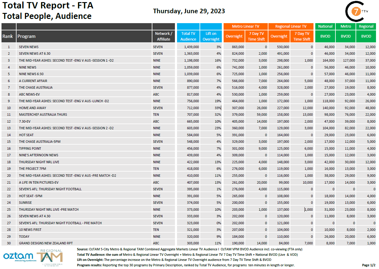 在最新的每日汇总7总电视报道,6月29日7新闻# 1项目总143.9万电视观众,与国家BVOD和46000年提高3%。