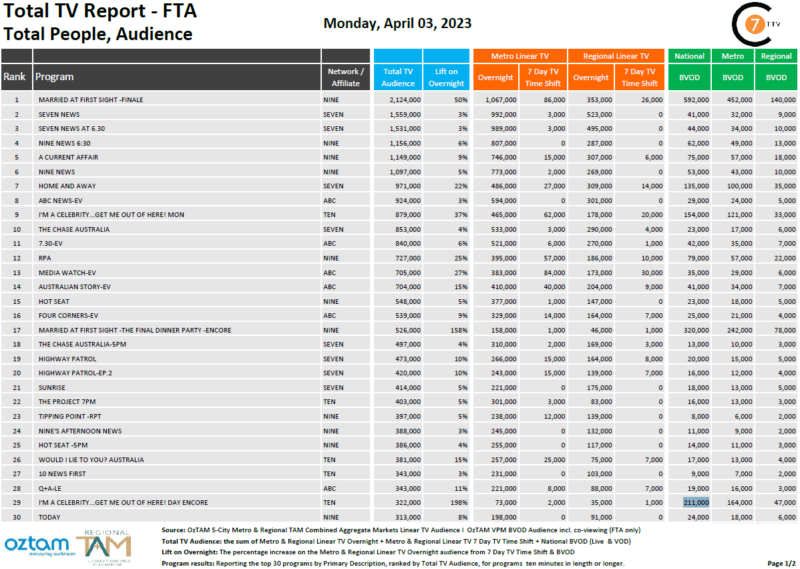 最近每天巩固7总电视报道4月3日,乍一看结婚的结局在上周一9 # 1项目全国电视观众总数为212.4万,其中包括592000 BVOD和50%的提升。