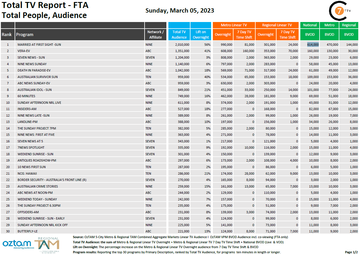 尽管地铁收视率有所下降前一周的高点9号的《一见钟情》(MAFS)是周日收视第一的节目,拥有86.7万名地铁观众,并在所有三个关键广告示范节目中排名第一。