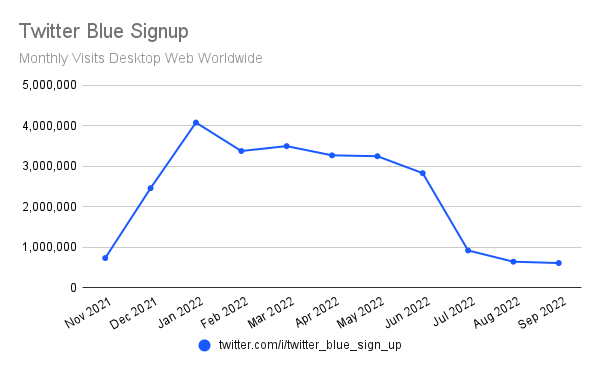 推特的订阅计划,Twitter的蓝色自7月以来,该网站的注册页面访问量不到100万。