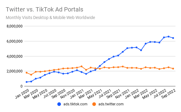 根据Similarweb的研究,9月份推特广告门户网站的流量同比下降了约11%,而TikTok的广告门户网站的流量却出现了上升,增长了51.5%。