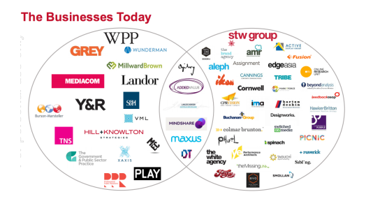 结合创意机构合并的时候包括白色,灰色,奥美,Y&R, Wunderman虽然有传立媒体机构方面,迈势、圣像和慷慨陈词,以及公共关系在PPR等利益。