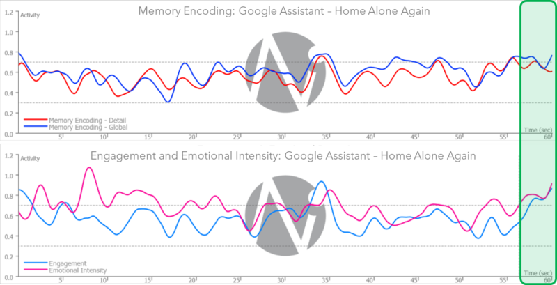 nerve - insight再次回顾了《小鬼当家》,以说明我们的指标敏感性与消费者行为之间的相关性。AdAge的Acuity Ads分析显示,谷歌的“再次独自在家”广告是2018年观看次数最多的节日广告。这在neural - insight的结果中得到了反映,在最终的品牌塑造过程中,表现出强烈的记忆编码、参与度和情感强度,结果在基准的第50百分位以上达到峰值(见图2)。