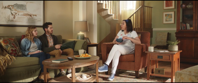 广告一开始,一对夫妇在客厅里与经纪人讨论保险问题。出乎意料的是,广告在播放美国摇滚乐队Smash Mouth的标志性歌曲《All Star》时,突然切换到广告的中场表演,然后突然回到保险的细节。这对夫妇接着询问保险代表吃的零食来自哪里,如图4所示。观众并没有通过怀旧和名人来承认幽默,而是感到困惑。考虑到保险活动主要建立在信任的基础上,这是进步党主要关注的问题。