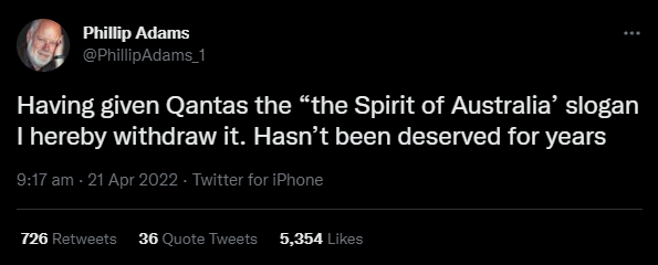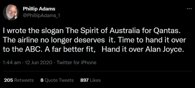菲利普亚当斯,作家创造了著名的“澳大利亚”的精神标语对澳航宣布在一条微博他撤回口号由公司进一步使用。