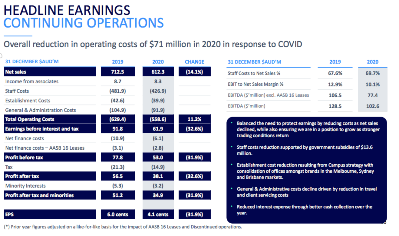 安装校园模式在布里斯班,阿德莱德和珀斯在去年的报告中宣布并整合了WPP在每个市场的办事处,为公司节省了270万美元。与此同时,员工成本调整了11%,采取了临时和永久性成本措施,例如自愿减薪计划董事会承诺在最初的三个月内将工资和费用削减20%。