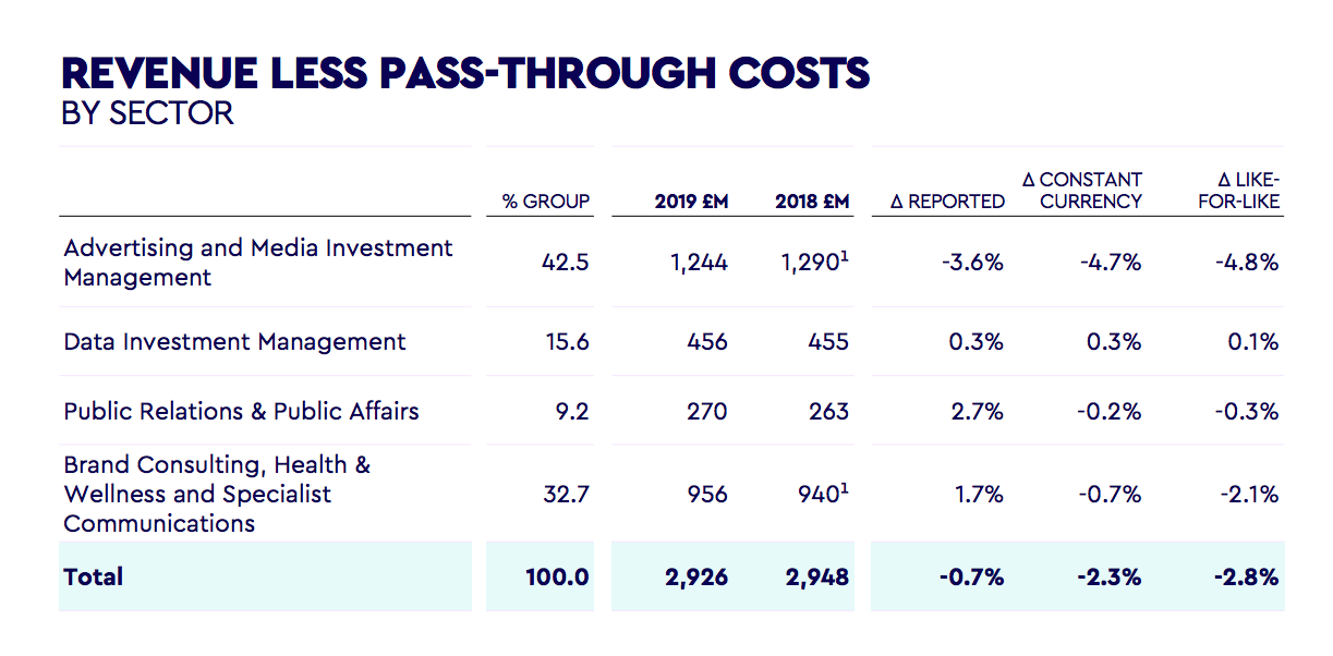 2019日历年前三个月的财务业绩不包括当地运营WPP AUNZ的业绩。