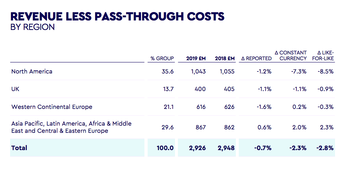 WPP在给投资者的报告中表示,北美是WPP业绩最弱的地区。该地区扣除转嫁成本后的收入下降了8.5%。