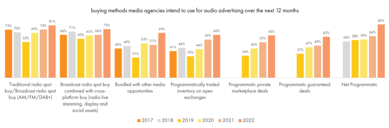 报告发现,80%的媒体机构购买了数字音频结合数字视频在2022年,从2021年的59%有所增加。与此同时,72%的人购买音频和数字显示,52%的人购买数字哦。